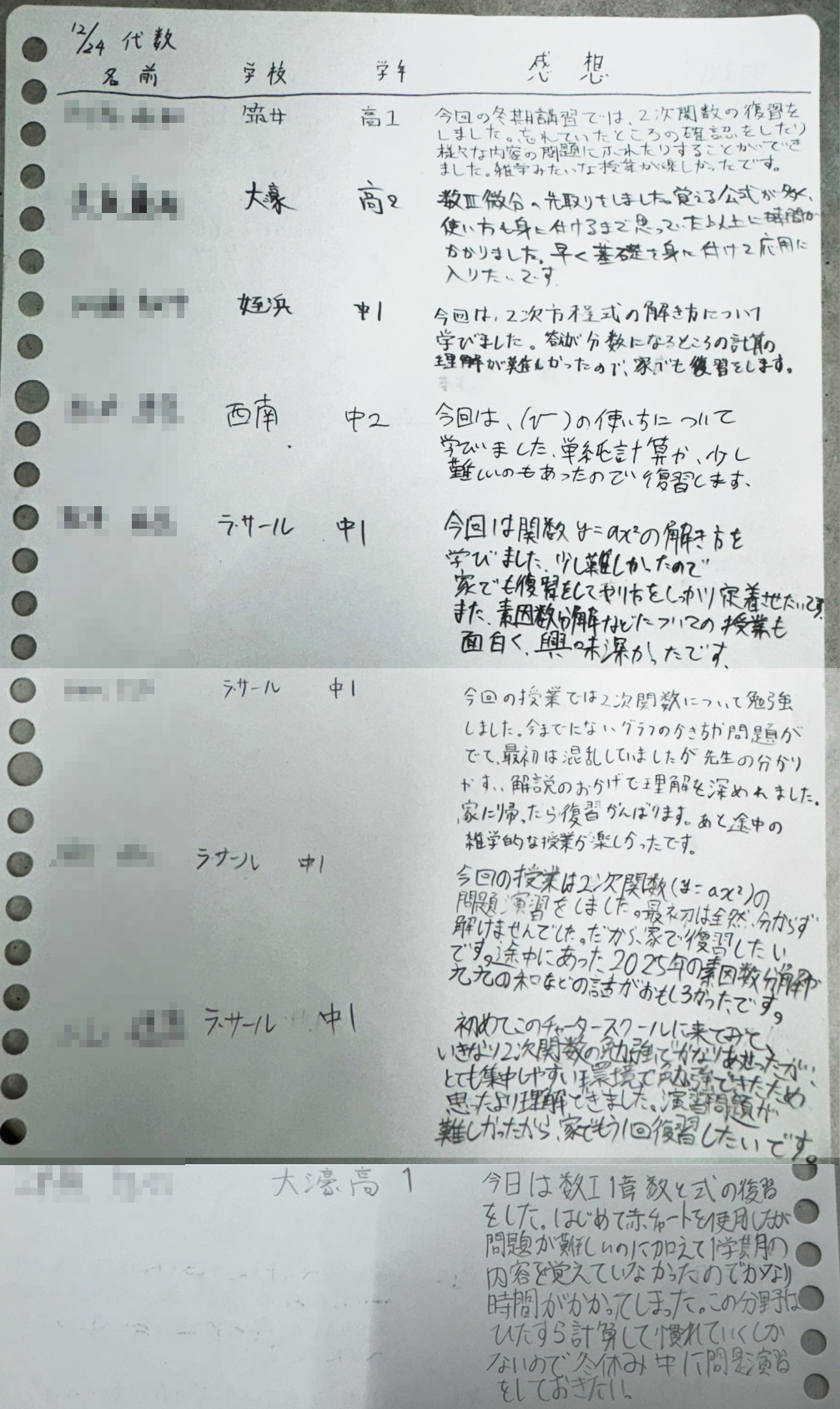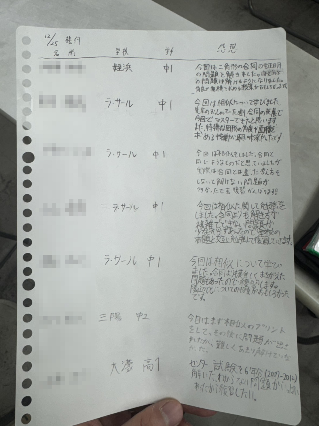 | 12/25(木) | ×(課外) | 高校物理/力学※@ | 中学数学/代数※A |