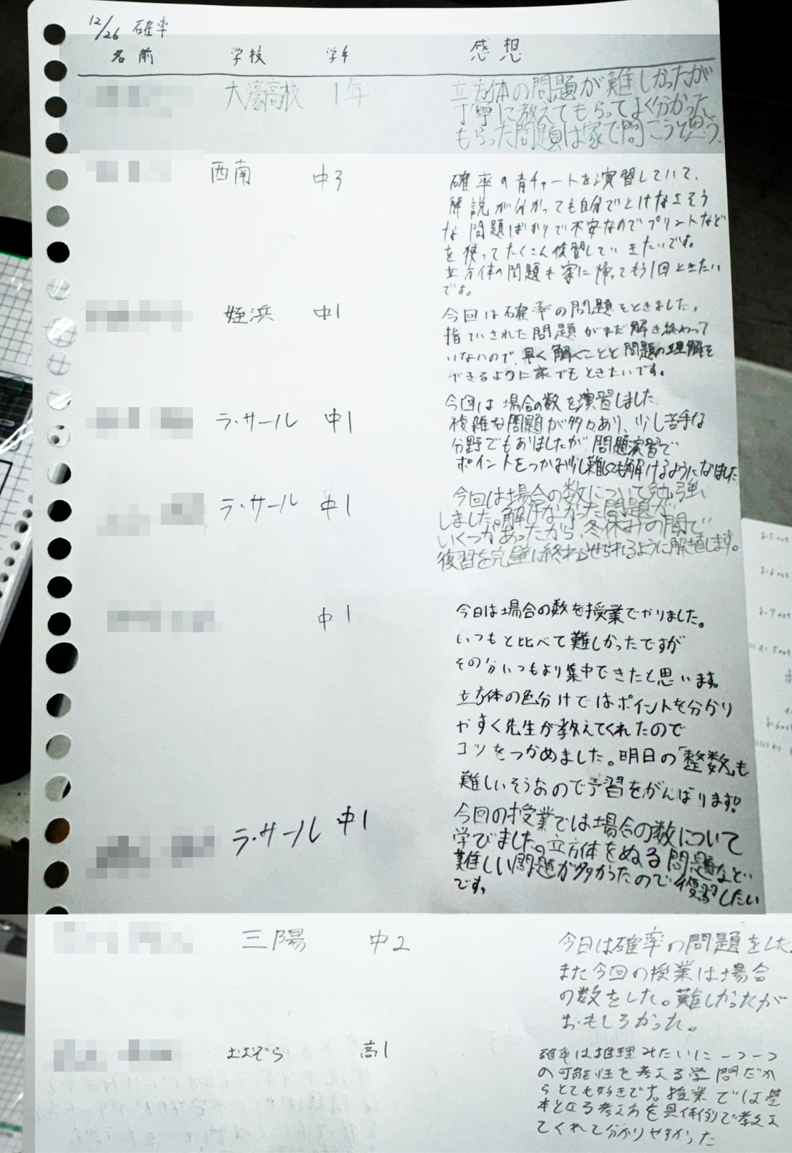 受験学年の生徒さんと、初学者の生徒さんとで演習問題の難易度を変えますが、各生徒さんと相談しながら難易度は調整しますので、「復習をしたい、苦手だからゆっくり説明してほしい」といったご要望がありましたら、ご遠慮なくお申し付けください。