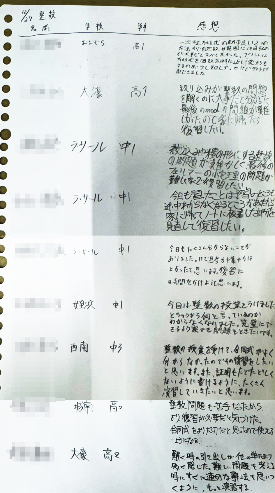 | 1/6(火) | ×(課外) | 中学数学/整数※A | (通常授業) |